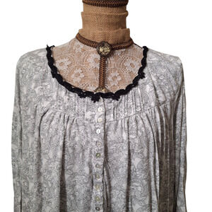 Feminine scoop neck nightgown with black lace trim, button accents and paisley print. Perfect for lounging and comfort.