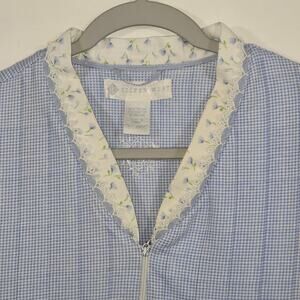 Eileen West Vintage Blue Gingham Robe. Size Large. Full Front Zip. Two Patch Pockets On The Front Trimmed In Blue Floral Fabric And Lace. Collar Is Trimmed In The Same Floral Trim And Lace. !00% Cotton, Measurements Pit To Pit 25 Inches; Length 36 Inches.