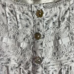 -Features: White nightgown with white lace details around the collar, light grey floral print, flower buttons