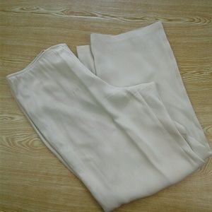 Gently used. Great condition with some flaws. Sign of wear. Both bottom pants have stains. Come with jacket ,sleeveless blouse and long pants. With thin elastic waist band. Very flowy and soft. Size large color IVORY jacket size med. Under shirt and pants size large