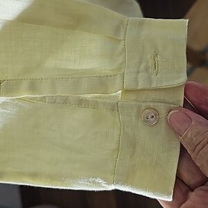 This lovely shirt is a beautiful shade of yellow. In very good condition and quality. It's oversized small. pit to pit flat measurement is 20". The sleeves are 17"