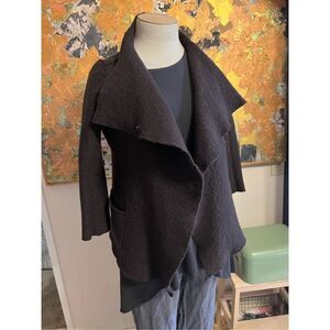 This is a boiled wool jacket with exposed seam and a snap front with a large collar from Eileen Fisher. Frankly, I think that someone may have a machine washed this to create an even more felted look. It fits more like a medium than a large, which adds to my suspicion that it has been washed. the fabric and Care tag has been removed, but it is clearly a wool or wool blend. and probably should not be washed anyway it still looks cute on and is very warm.