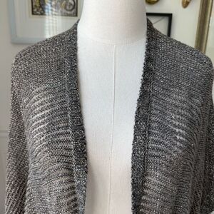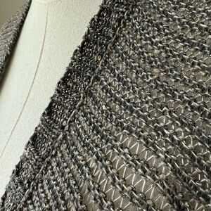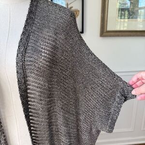 Light and airy Eileen Fisher variegated link taupe color cardigan with subtle silver metallic shimmer. The taupe is created by mixing gray and tan threads, but the manufacturer causes the color bronze. Retailed for $278.