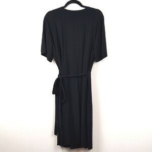 This elegant Eileen Fisher black wrap dress is perfect for any occasion. Its sleek design offers a flattering fit, making it a versatile addition to your wardrobe. 60% Tencel Lyocell and 40% Viscose for a soft feel and a stretchy body skimming fit. Size 16.
