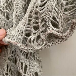 Eileen Fisher Wonder Scallop Crochet Sweater in variegated oatmeal cotton/linen yarn, a few spots where the yarn has been pulled but no damage (just the nature of the pattern). Excellent pre-worn condition.