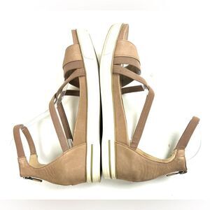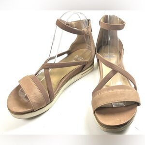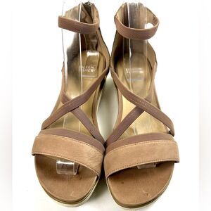 In good used condition Eileen Fisher Sway ankle strap Nubuck Sandals. Step out in style with these chic tan sandals. Perfect for any occasion, they offer both comfort and elegance. Slip on style with elastic gore for comfort and fit. See photos for measurements and wear.