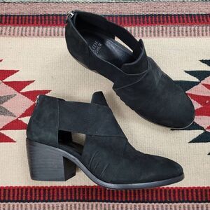 Eileen Fisher Walt Crossover Cut Out Leather Bootie Sz 7.5 Black Back Zip EUC