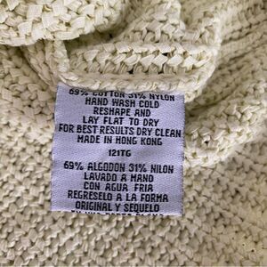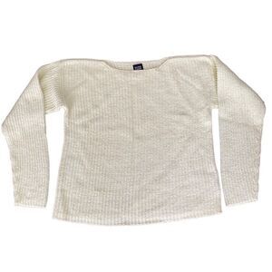 Eileen knit sweater in size medium. The shirt is pre-owned and there are no stains or rips. Minor wear. The sweater is a very creamy colour with green undertones.
