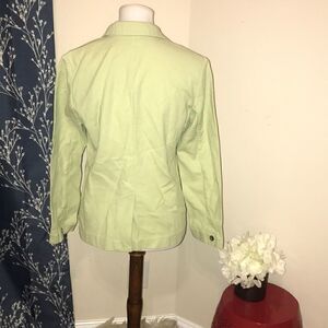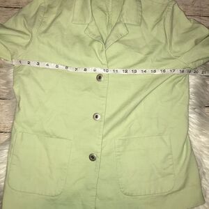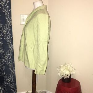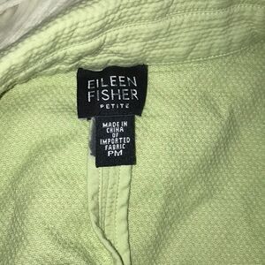 Good, preloved condition. Eileen Fisher Petite Lightweight Blazer Jacket. Light green shade. Collar. Snap front buttons. Front pockets. Textured cotton. Marker on the inside of the jacket, as shown. Slight over all wear. 98% cotton, 2% spandex.