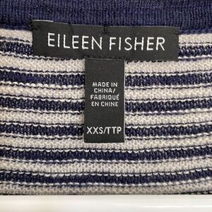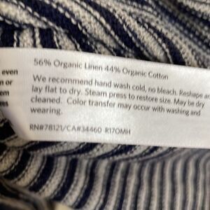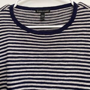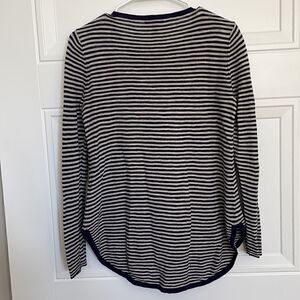 Beautiful preowned linen/cotton blend sweater. It’s navy blue and gray striped with navy trim around the neck and hem. It’s tunic length. Oversize fit