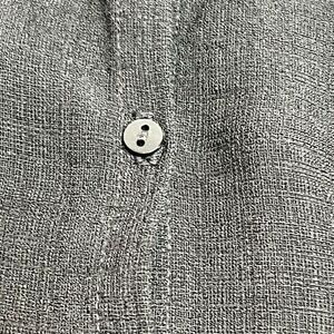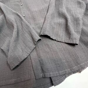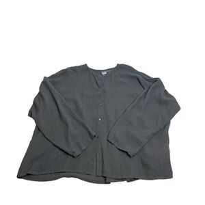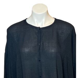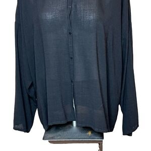 Eileen Fisher black linen blend button up top size M. Style J862. Cut 123364. No collar. Small buttons. Wide cut. Good condition. 75% viscose 15% linen 10% nylon. Length 25” Chest 28”.