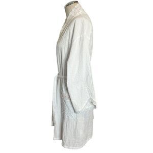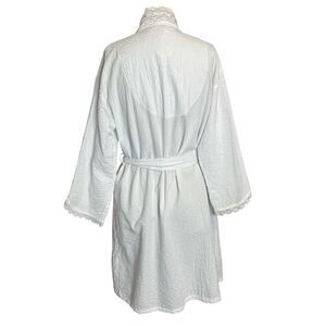 Eileen West Robe S/M White Seersucker Pink RibbonEyelet Lace Cottage Core Lounge