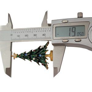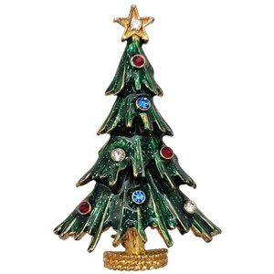 Pin this impressive accessory on chic clothing for casual style, on the lapel of an evening dress, or high on the elegant shawl, that is sure to light up your Christmas Holiday occasion look. It features a lovely green enameled Christmas Tree pin, decorated with rhinestones in colors of blue, red, and clear accentuating the branches on this lovely tree. A gold-tone star with clear rhinestones is placed on the top of the tree. It measures approximately 1.2 inches in width and 1.9 inches in length. This Christmas Tree Brooch is hallmarked EISENBERG ICE on an oval cartouche on the back. The pin back is straight and string, clasp locks securely, ensuring that it stays firmly attached to your clothing or accessory throughout the day.