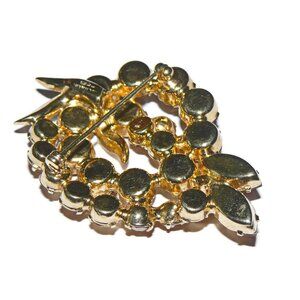 This exquisite piece from Eisenberg Ice brings the sparkle of gold-plated topaz-colored crystals, embedded in round and navette shapes, to life. With a white rhinestone ribbon delicately draped across the top, this brooch is sure to evoke luxury and sophistication. Crafted with the utmost attention to detail and signed with the iconic 'Eisenberg Ice ©' tag, this classic piece will add an elegant splash of glamour to any ensemble.