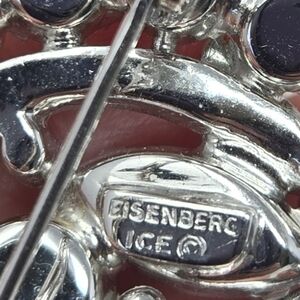 The Eisenberg Ice Women's Clear Rhinestone Brooch Pin in Silver Tone features a vintage flower design with a curved stem, making it a perfect accessory for occasions like Christmas, anniversary, or birthday. The clear rhinestones set in the silver tone base metal add a touch of beauty and elegance to any outfit. This original piece by Eisenberg Ice is signed, made in the United States, and captures the theme of beauty, art, and flowers & plants, making it a unique and stylish addition to any jewelry collection.