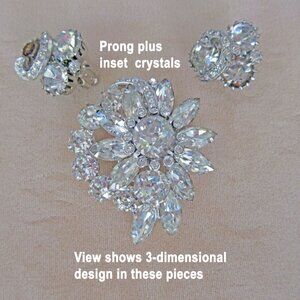 Both the earrings and the brooch feature the ribbons of tiny rhinestones combined with large chunky stones for which Eisenberg costume jewelry is so famous. Round, marquise and tiny inset rhinestones together to make stunning sophisticated designs.
