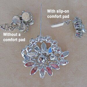 The rolling C back clasp on the brooch is not bent or damaged and the clasp is secure. For the earrings there is a comfort wide clip back that remains secure.