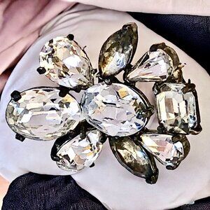 Condition: One rhinestones if very dark and one is grayish. Both those rhinestones would need to replaced to make all 9 stones sparkle again. The back clasp works securely.