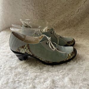 Eject leather& suede blue lace shoes with patent reptile prints trim EUR SZ40.3”heels rubber soles.pre owned in good used condition small scratch on the back heels see all pictures any questions please message.