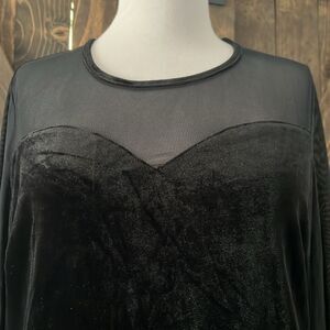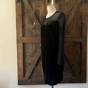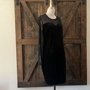 Features: Women velvet club dress, sexy dress, long sleeve, slim fit, sheer mesh patchwork, round neck, above knee length, club party style, solid color, elegant bodycon mini dress