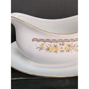 Ekco International Golden Autumn Double Pour Gravy Boat Attached Plate