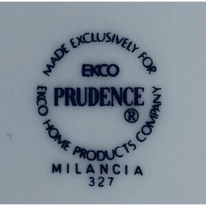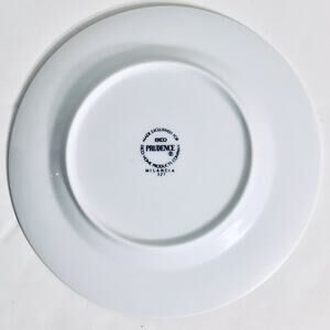 This set of four Ekco Prudence MILANCIA Rim bread/dessert plates is a great addition to any mid-century modern collection. The glossy white ceramic material with a beautiful floral pattern is perfect for all occasions, whether it's a fancy dinner or a casual gathering. The plates are 6 5/8 inches in diameter and feature a painted backstamp.