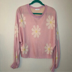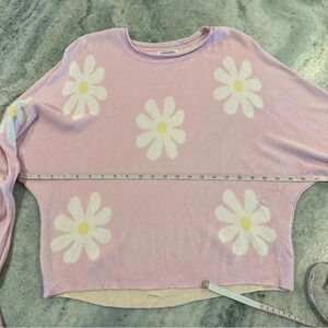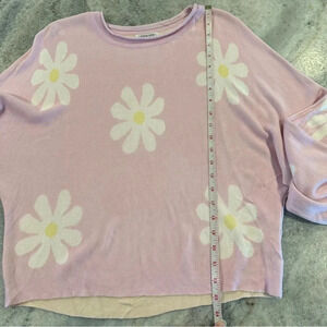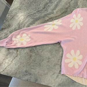 So cute lavender- pink colored sweater with white and yellow daisies, round neckline, soft and lightweight sweater, Excellent pre owned condition