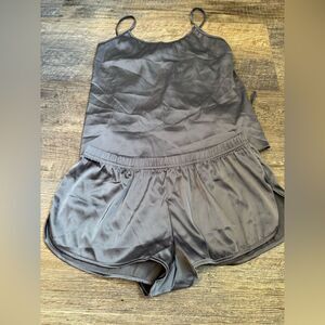 This gray pajama set features a tank top with delicate spaghetti straps and matching shorts with an elastic waistband for a relaxed fit. Made from soft, breathable fabric, it's perfect for a restful night's sleep or lounging in comfort. The simple, classic design ensures timeless style in your sleepwear collection.