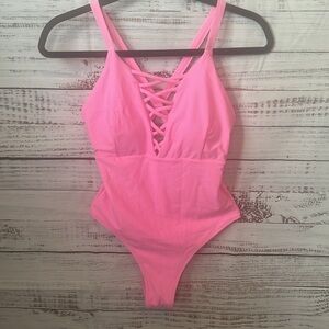 Ekouaer Women's Bathing Suit Plunge V Neck One Piece Swimsuits Vintage Lace Up Swimwear Hot Pink,Small