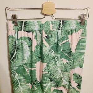 Stylish pajama pants by Eqouaer, size small. Pants have a vibrant green leaf print; perfect for a tropical look. Features green leaves on a light pink background. Pants are pullon style Casually cool and comfortable. Pants are in excellent pre-owned condition; no flaws. Can pair with matching pajama shirt in the same size (in a separate listing).