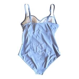Elegant powder blue one-piece swimsuit by Ekouaer. Features a flattering sweetheart twist bust, built-in cups with mesh lining, and ruched sides for tummy control. Size Large.