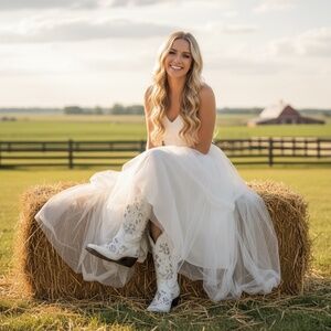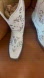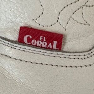 These El Corral beautiful leather boots they are primarily a pristine white, crafted from high-quality leather. They smell so good...leather smell. These would be awesome for a western wedding. The white may have a subtle, weathered or slightly distressed finish for added character. They feature elaborate and intricate cut-out designs or inlays with a contrasting darker color muted silver underneath, creating a striking visual effect. The leather underneath has silver sparkles.