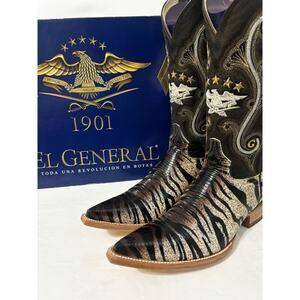 Step out in style with these El General Cowboy Boots in Tiger Stripe Lizard Skin Exotic Leather Brown. These boots are perfect for any occasion, whether it be casual, formal, workwear, or business. The pointed toe and pull-on closure add to the overall stylish design.