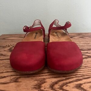 These are red/wine colored El Naturalista Wakataua Pleasant Tibet sandals. They fit like a 8W. They are brand new and never worn.