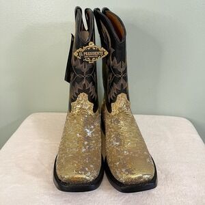 El Presidente Gold Black Leather Sequin Square Block Western Boots Size 10 NWT