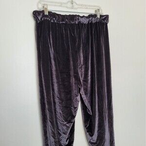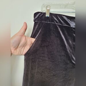 Very classy Black velvet trousers pants by Elaine Kim. Straight leg, high waist fit, elastic waistband and pockets. Inner lining is smooth and sleek. Back of waistband's inner elastic is folded over slightly. Tagged size XL measures approximately 41 inches long 29 inseam (12 rise) 32 waist.