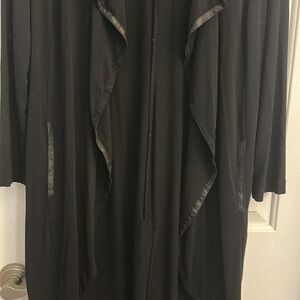 Elaine Kim nolwenn cutaway long line open front cardigan jacket black large leather trim