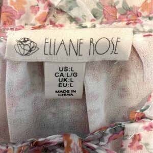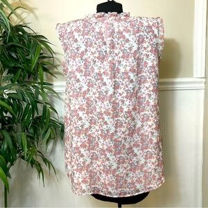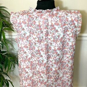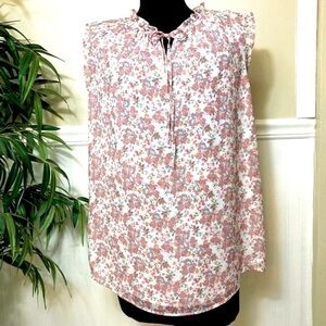Elaine Rose, floral blouse, sleeveless with a tiny ruffle around the sleeve opening. Gathered around the collar with a small ruffle and front tie keyhole opening. Floral fabric is sheer, but the shirt is fully lined. It is slightly longer in the back. Excellent preowned condition, no flaws. Size large, measures 21.5 inches. PTP.