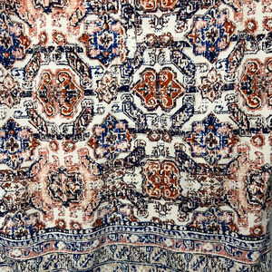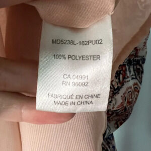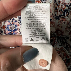 Elaine Rose medallion print shift dress in peach, burnt orange, blue, navy, white, and pink. V-neck with hidden button closure. Fully lined in peach. Size 6. In excellent preowned condition! Measurements taken when dress is lying flat and are approximate.
