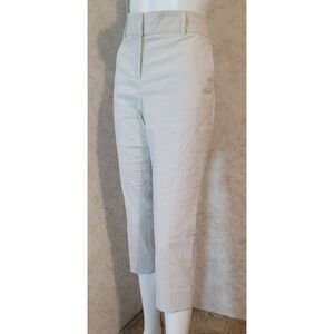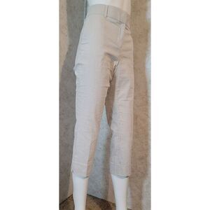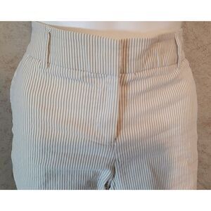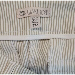 Elain Rose tan/cream pinstripe capri with two front slip pockets, extra wide waist band and 2" slit and the hem. The back pocket are faux. These lightweight capris are unlined and have a button as well as a double hook closure and zipper. In excellent used condition.