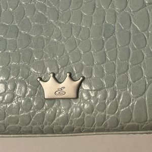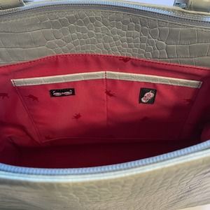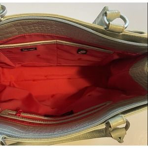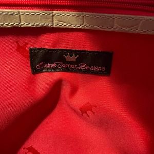 This creamy green croc printed satchel is stunning. no visible scuffs or marks. lining is beautiful red with Elaine Turners logo weaved throughout. Very high quality.
