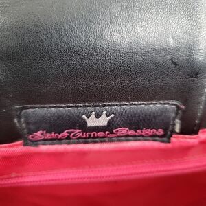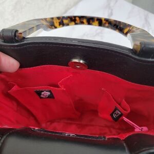 Featuring plastic faux tortoise shell handles Gold crown emblem on the lower front center and inside the bag