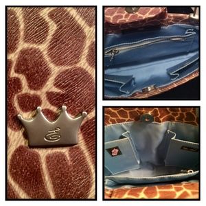 Structured bucket tote by renowned Houston designer, Elaine Turner. Hard to find, early design. Coated & textured canvas with small giraffe print. Stainless steel handles. Lined with four inside pockets (3 slip, 1 zippered). Magnetic closure. Crown logo on front. Very good condition with minimal signs of wear on exterior. Interior is very clean but shows fading. Please reference pics or ask questions for particulars. Smoke free home.