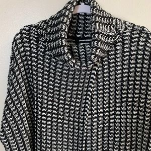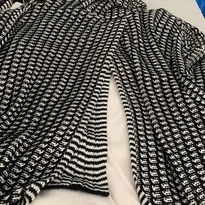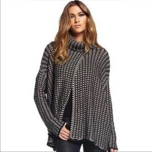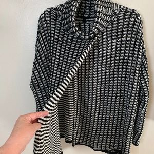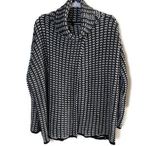 Stylish cowl neck sweater. Black and white pattern. Cozy and chic design.