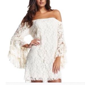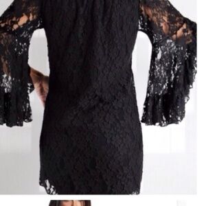 Beautiful on or off the shoulder lace dress in black. Sleeves are gorgeous. I wear one of these and get soooo many compliments every time. Wear year round, alone or even with leggings. So easy to wear and beautiful. Fully lined except for sleeves. Medium measures 18.5 pit to pit and large is 20. Length down the middle is 29 on both. New but no tags as I purchased a set of these that were packaged together. Medium weight, not see through.