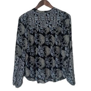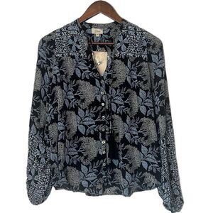 Elan Blue Floral Print V-Neck Button Up Tassel Blouse Top. New!