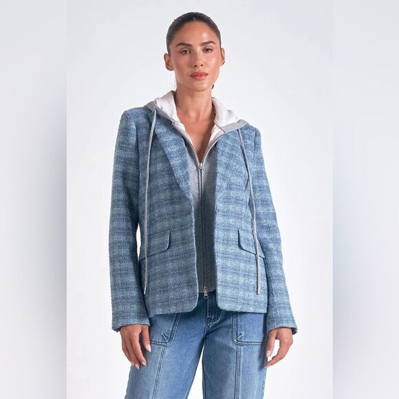 Elan Blue Plaid Long-Sleeve Layered Blazer Hoodie