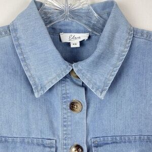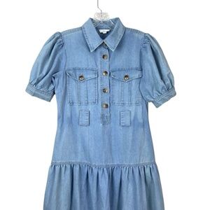 Elan Cotton Denim Tiered Shirt Dress XS Button Front A Line Puff Sleeve Blue