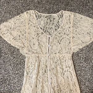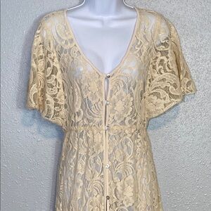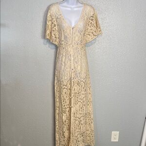 This beautiful Elan cream lace button down dress is perfect for so many styles. Layer this dress for a romantic evening out. The dress boasts a flattering v-neckline and elegant flutter sleeves, adding a touch of sophistication to its maxi length. Its graceful design ensures you make a memorable entrance at any occasion. Dress up or down, buttons all the way down. Dress does not include under lay, so slip is needed. VGUC. Size medium. Pit to pit open. Waist 13”. Shoulder to hem 57”.