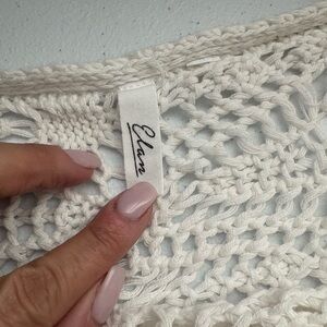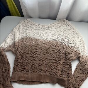 This Elan sweater features a beautiful cream and brown color scheme with a lightweight open-weave design. The intricate knit pattern showcases a repeating geometric motif, complemented by long sleeves and a rounded neckline, making it perfect for layering in warmer weather.